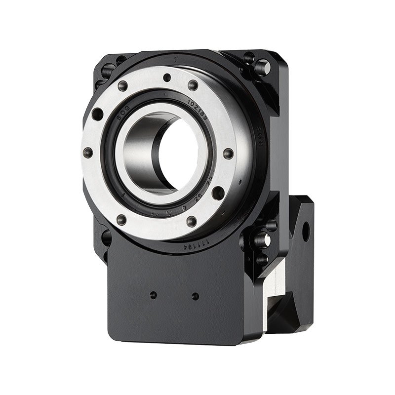 GD中空旋转平台采用单级螺旋齿轮减速方式来增大输出扭矩,齿轮精度等级JIS2级以上,加之灵活的调隙机构,通过改变两齿轮中心距的方式来控制侧隙,使得中空旋转平台的空回极小,重复定位精度在1 5弧秒以下。