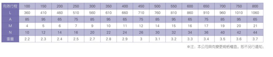 2、螺杆转速超过临界转速时可能发生共振,临界转速和螺杆长度有关,故滚珠螺杆的临界转速也间接决定了滑台模组的有效行程和总长度,有效行程和常用螺杆规格转速的关系如下列表格。