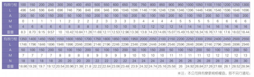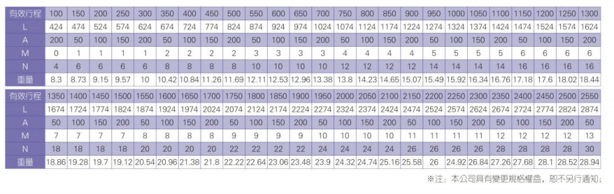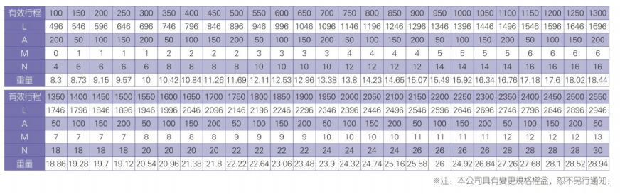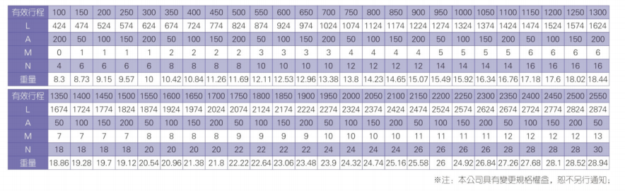 2、螺杆转速超过临界转速时可能发生共振,临界转速和螺杆长度有关,故滚珠螺杆的临界转速也间接决定了滑台模组的有效行程和总长度,有效行程和常用螺杆规格转速的关系如下列表格。